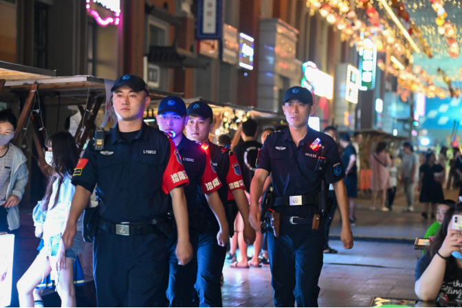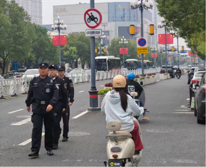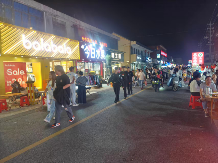 国庆期间,“建军路上的摇滚”等活动在竹林大饭店西广场开唱,搭配激光秀与创意市集,以及“我爱你中国”主题朗诵、新疆歌舞展演等活动交织,建军路这条“老街”在热闹的人潮中焕发着新活力。盐城市公安局亭湖分局巡特警大队依托铜马警务站“巡逻防控+应急处突+服务群众”职责体系,在人流密集的建军路文商旅街区织密平安防线。
