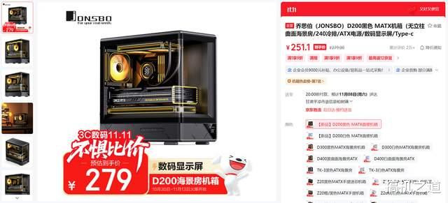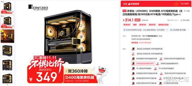 机箱选择了乔思伯 D400,该机箱采用了无立柱曲面玻璃设计,算是目前视角效果比较不错的海景房机箱了;机箱结构也非常不错,上下分仓式设计,风道独立,散热效果更出色;并且机箱还非常能装,安装双360冷排,长显卡都不在话下。该机箱近期售价仅为314.1元,算是史低价了。