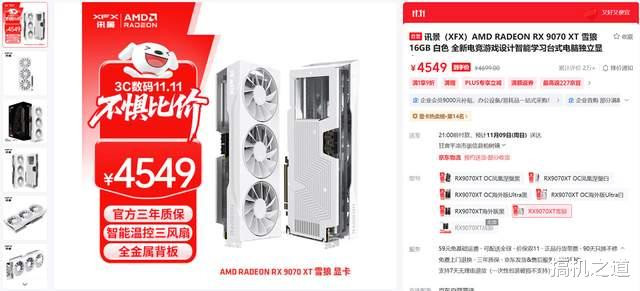 显卡方面推荐RX 9070 XT,该显卡采用了新一代RDNA4架构打造而成,拥有4096个流处理器和128个AI加速单元,游戏性能都比对手家的RTX 5070 Ti 16GB略胜一筹,但价格却便宜了至少1600元。目前某东上最便宜的RX 9070 XT是讯景 雪狼,售价仅为4549元,有时候还会有4499元的特价,感兴趣的玩家可以蹲守一波。