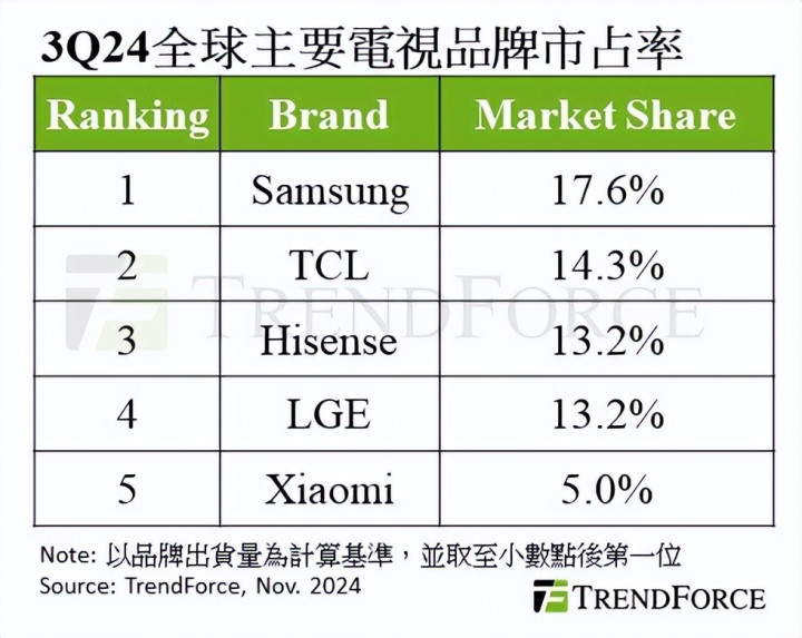 三星以17.2%稳居第一,LGE以11.7%守稳第四,TOP5合计市占率达64.3%,行业集中度持续提升。在全球市场整体萎缩的背景下,只有掌握核心技术与全球渠道的巨头,才能穿越周期。