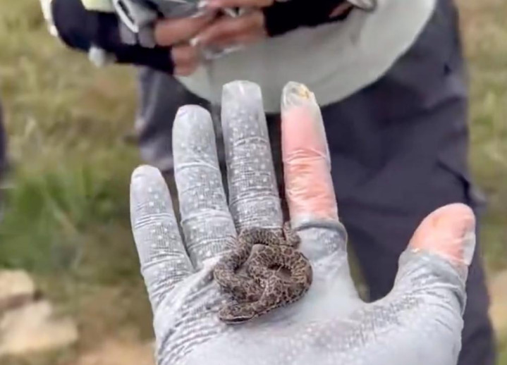 一名驴友在爬山时捡到一条幼蛇