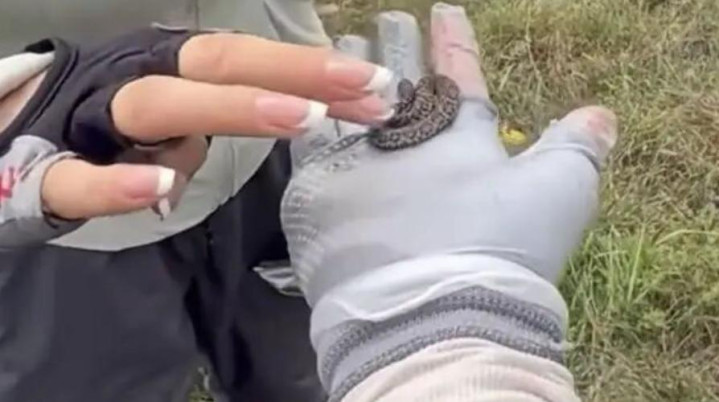 视频中,周围人上手抚摸幼蛇。图源:国家应急广播